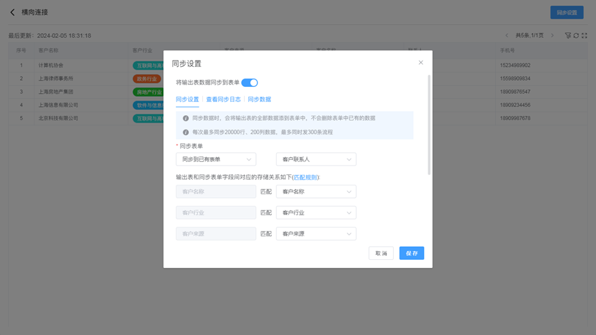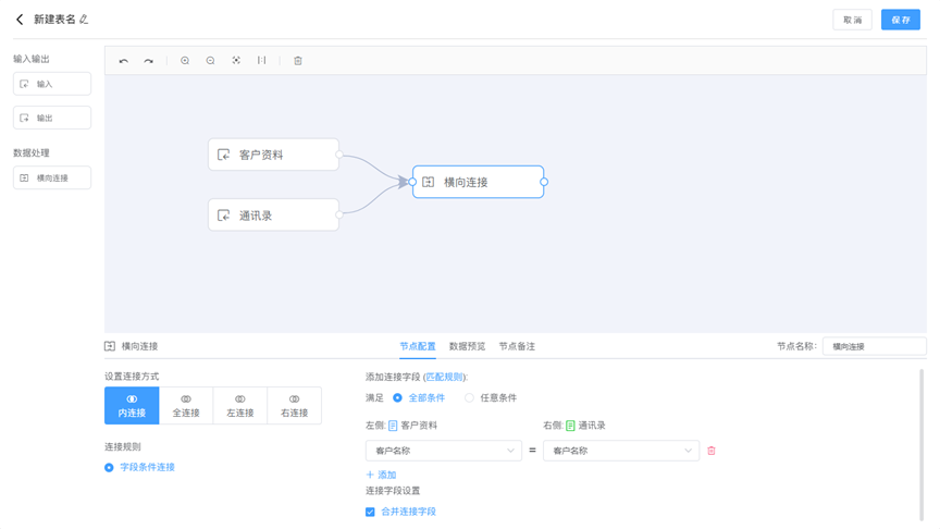 横向连接将两个工作表中的数据合并到一张工作表中,横向连接时,左右两个工作表需要有相同的字段。例如:客户资料是一张表,通讯录是另一张表,他们有共有的字段客户名称。可以通过客户名称字段将两张工作表的数据合并为一张工作表,便于用户分析数据。