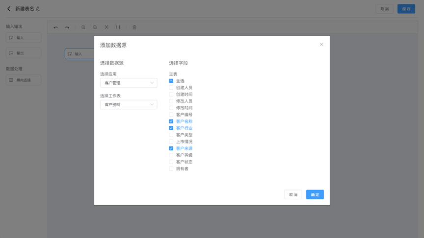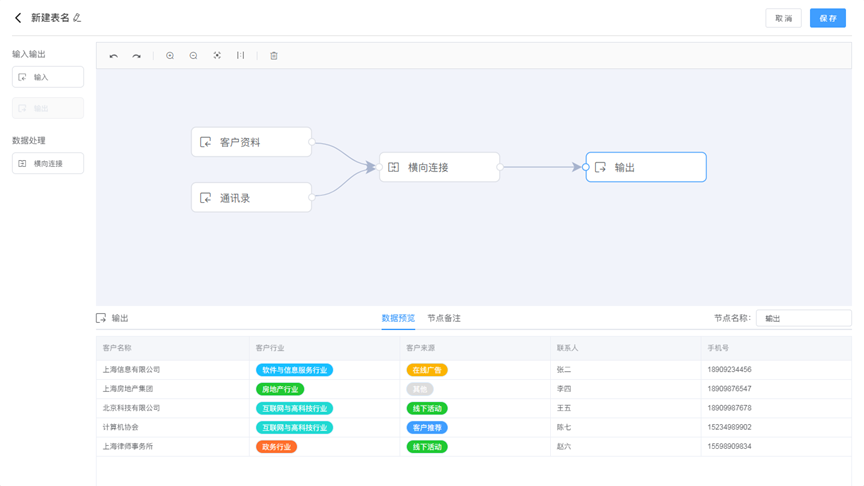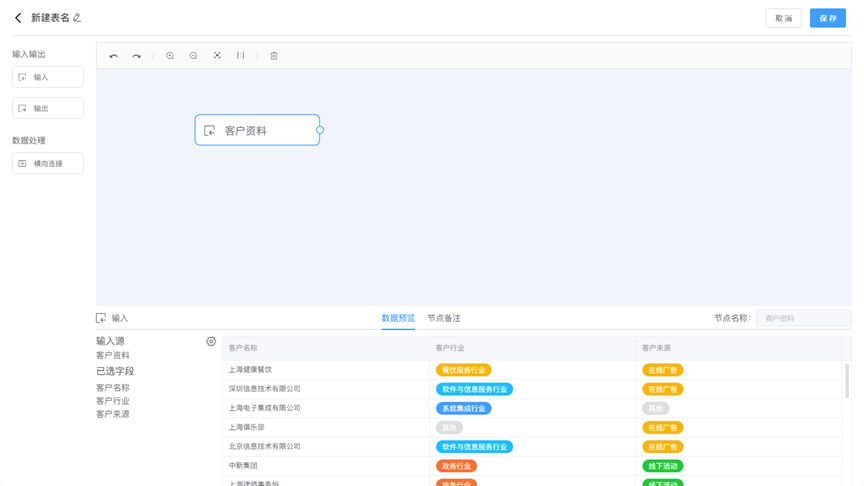 数据工厂 数据工厂的作用在于将企业中分散的数据整合在一起,并进行汇总计算,从而实现数据的统一管理和分析,帮助用户从多个视角来分析和解释数据,得出更准确和深入的结论,让数据发挥更大的价值。 输入节点是数据流数据输入的入口,用来选择要处理的数据源。从左侧控件区将输入节点拖拽至右侧,设置数据源和显示字段。点击输入节点,可以预览数据源。