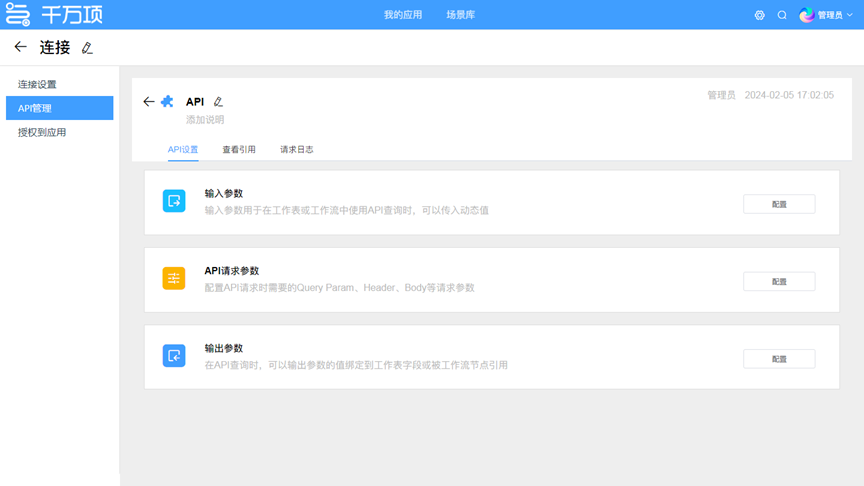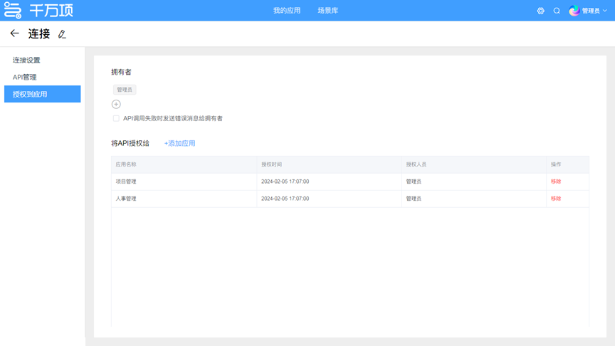步骤三:授权给应用。将集成中心配置好的API,配置连接的拥有者,错误提醒机制和授权应用。
