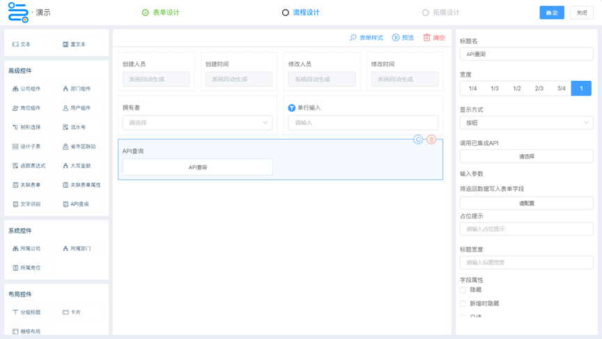 表单设计 API查询控件 表单设计中,增加API查询控件。可以通过此控件调用外部API接口获取数据,并将获取到的数据直接填充到表单字段中。