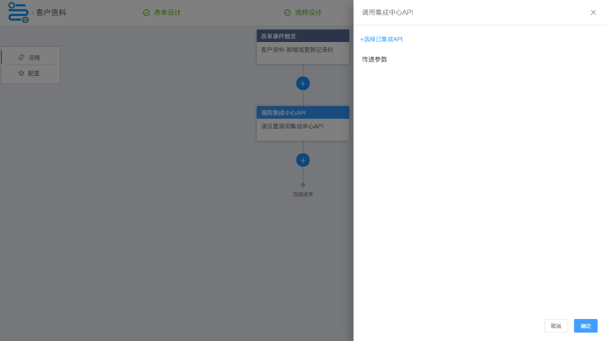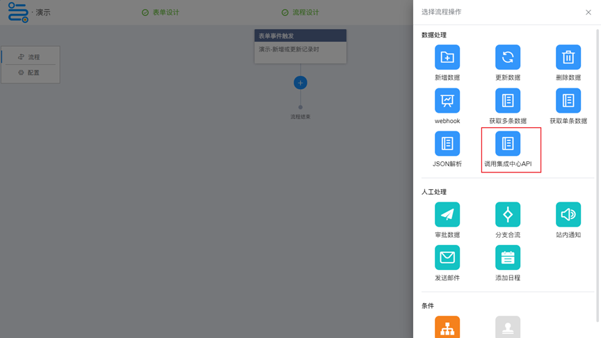 流程设计 流程设计中,数据处理增加调用集成中心API节点。 在集成中心配置好的API,可以通过此节点直接调用,获取到的数据可以被后续节点使用。