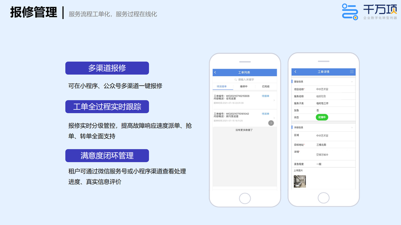功能三:维修管理 房产维修是租赁管理中不可忽视的一环。房产资产租赁管理系统为用户提供了便捷的维修管理功能。用户可以记录和追踪维修工单的处理进展,及时通知租客维修状态,并与维修供应商进行有效协作。此外,系统还可自动生成维修报告和费用明细,帮助用户及时核算维修费用,确保资源的合理利用和成本的有效控制。