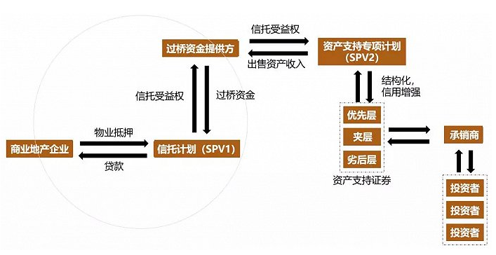 通过母公司或者其他过桥资金提供方形成信托计划向地产企业(借款人)发放信托贷款,地产企业获得资金并向信托计划抵押地产。过桥资金提供方则成为信托计划的受益人。CMBS的基础资产由此形成,也即基础资产为过桥资金方让与给SPV的信托收益权。资产支持专项计划通过支付对价给过桥资金方取得信托收益权,间接获取物业的未来收益。 类REITs交易结构: