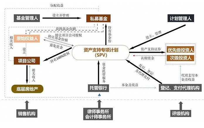 在做资产证券化的过程当中,需要构建一个基础资产的过程,构建SPV持有特定资产的结构就是基础资产重组的过程,SPV通常为项目公司,且无其他业务以及业务无关的对外负债。 此外,关于现金流完善和增信方面,一般可以通过以下方法完善现金流: ①补签租约 ②租约调整,将物业管理费、服务费等调整为租赁收入 ③差额补足 六、参与机构及职能 通常一个资产证券化产品,参与机构与职能有: 七、类REITs与CMBS的比较: