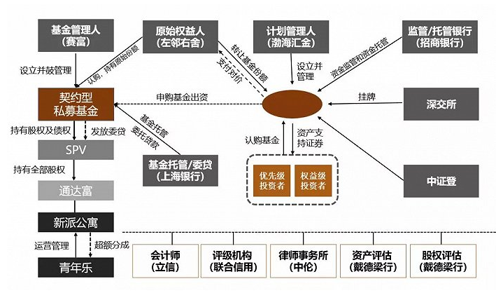 以新派公寓REITs交易结构为例,新派公寓这一单REITs和标准的REITs很像,新派的REITs物业资产是新派公寓CBD公寓楼(含101间青年公寓)。可以看下图为例: